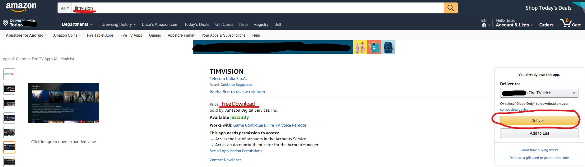 Comunque ho visto che anche su PC, dal sito Amazon, una volta trovata l’app TIMVISION ed andando nella sua pagina specifica di descrizione, la si può acquistate (a gratis) e poi, premendo il pulsante Deliver, si può far sì che venga “consegnata” al device indicato nella combo soprastante (i.e. la tua Fire TV Stick): immagino che in quel modo, la prima volta che si utilizzerà il proprio Fire TV Stick, quell’app verrà automaticamente scaricata/installata (analogamente a quanto avviene quando si acquista un ebook sul Amazon e poi uno lo se lo ritrova sul proprio Kindle).