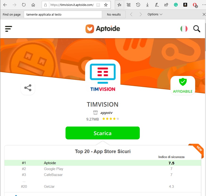 Si noti che attualmente esiste una versione di TIMVISION anche su Aptoide TV (vedi il metodo spiegato successivamente per installare RaiPlay), ma si tratta attualmente di una versione vecchia che richiede ancora i Google Play Services non presenti nel dispositivo, per cui a maggior ragione, anche lei non funziona una volta installata: anche in questo caso, nel futuro potrebbe esserci qui una versione compatibile …