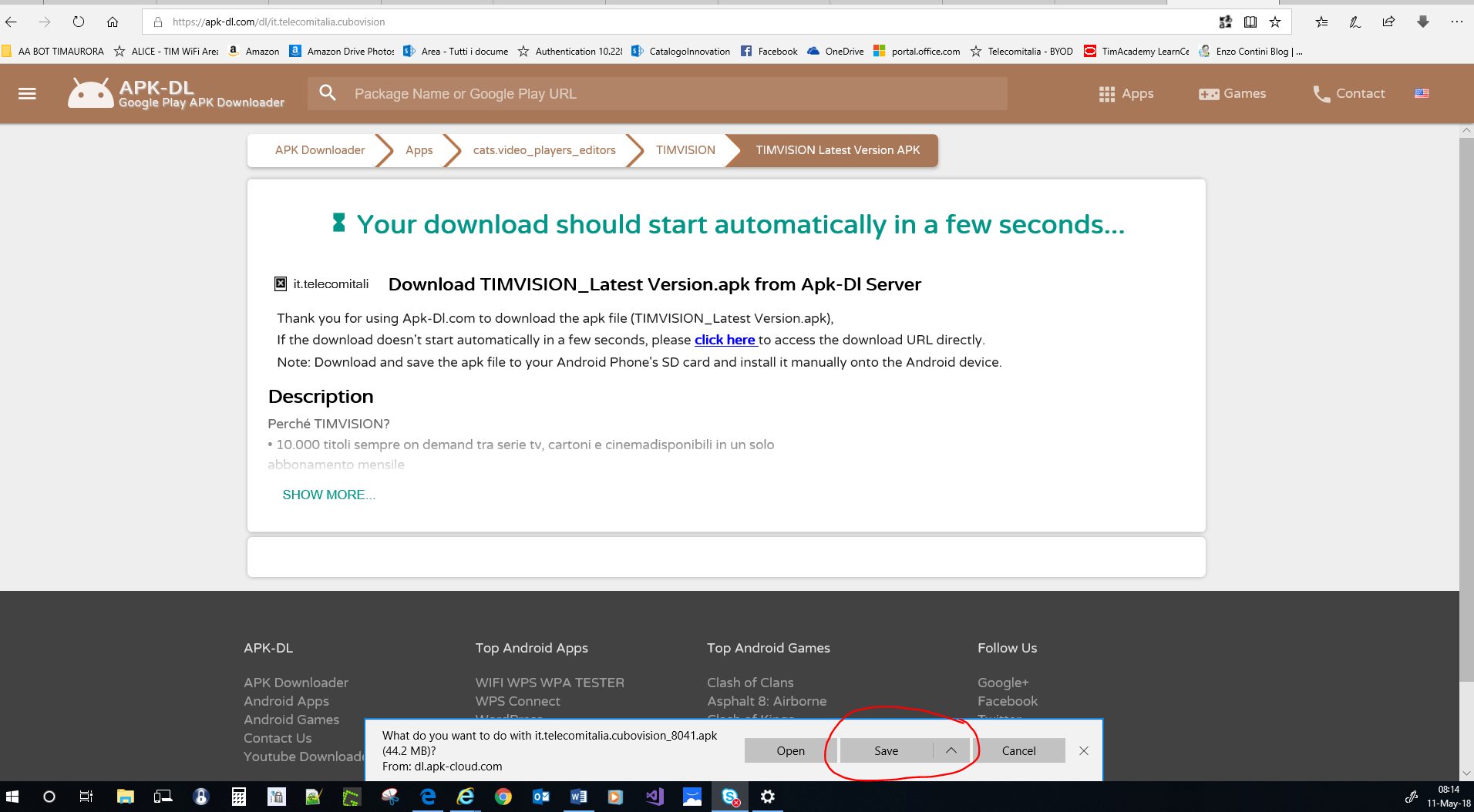 Esistono comunque guide che descrivono come installare comunque sul Fire TV Stick l’ultimo apk disponibile nel Play Store (e.g. come installare Sky Go su Amazon Fire TV Stick, Rai Play e TIMVISION, come continuare a guardare YouTube). Per scaricarmi perciò l’apk dell’ultima versione Android di TIMVISION sul proprio PC, per poi successivamente installarlo sul Fire TV Stick, si può utilizzare il metodo descritto in questo video, utilizzando il sito APK Downloader: attualmente, come dirò in dettaglio nel seguito, neppure questa procedura mi ha consentito di avere quell’app funzionante sulla chiavetta, ma lo era e forse lo sarà nuovamente in futuro in passato, per cui nel seguito la descriverò comunque. La procedura richiede che, una volta ricercata con il PC l’app TIM VISION nel Google Play Store, si copi l’URL di quella pagina (e.g. https://play.google.com/store/apps/details?id=it.telecomitalia.cubovision ) e la si inserisca nel form di un sito che consenta il download degli apk (e.g. APK Downloader) per scaricare il file di installazione di quell’app. Premendo il tasto di Invio in quel form, si giunge ad una successiva pagina dove, premendo il tasto DOWNLOAD APK FILE, si attiva la procedura di download sul PC della versione più recente di quel file (i.e. it.telecomitalia.cubovision_8xxx.apk).