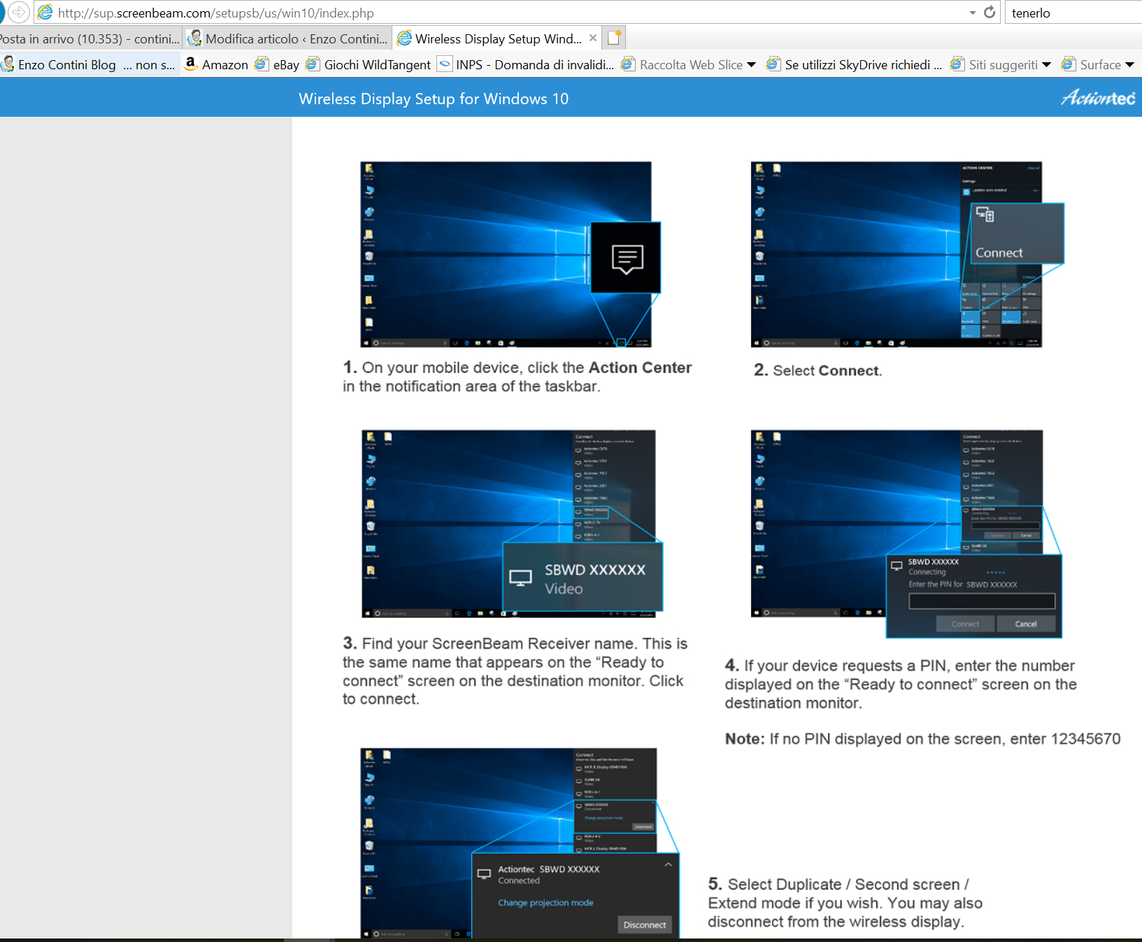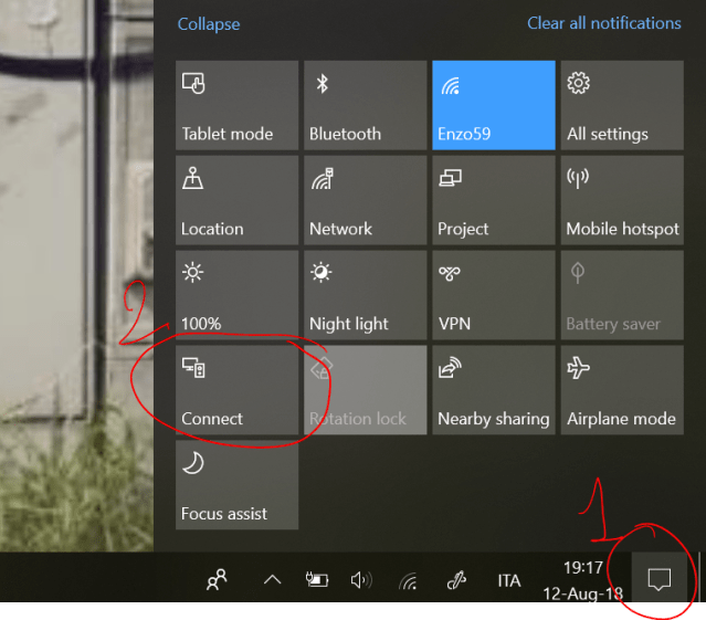 Nel seguito mostro un esempio di utilizzo di un dongle Wireless Display receiver e come effettuare il collegamento di un dispositivo Windows 10 come client per una visualizzazione con continuum. Nel caso mostrato d’esempio, il dispositivo collegato è uno smartphone Windows 10 Mobile ma la modalità è analoga con qualsiasi dispositivo Windows 10 perciò anche su un PC/tablet, come indicato anche in dettaglio nella pagina relativa al prodotto ScreenBean Mini 2 che redirige alla pagina di istruzioni specifica del dispositivo con cui si sta navigando, essendo presumibilmente quello con cui si desidera effettuare la connessione. Quelle indicate in quel link sono istruzioni abbastanza generali, valide perciò qualsiasi sia la marca del dongle. Sostanzialmente si tratta di lanciare l’app Continuum se si è su smartphone Windows 10 Mobile o l’app Connect (presente anche come tile nell‘action centre) se si è su PC/tablet Windows 10.