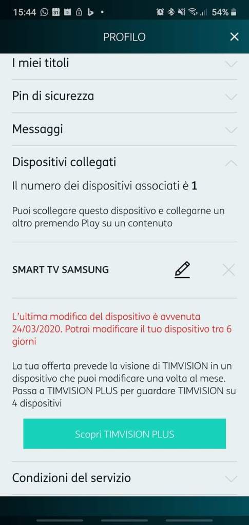 P.S 29/3/2020 – Probabilmente è già da qualche mese (dal 30 settembre 2019), ma me ne sono accorto solo ora. Non solo è possibile vede8re TIMVISION con un solo dispositivo alla volta, come un tempo pubblicizzato, ma esiste un vincolo di poter cambiare il dispositivo con cui vederlo solo dopo 1 mese da quando il precedente viene registrato (anche se poi dalla scritta in rosso sembrerebbe che sono sufficienti “solo” 15 giorni)! Questo vincolo è davvero fastidioso e immotivato anche da un punto di vista tecnico. Come evidenziato anche in un thread del forum della Community TIM, dove sono presenti diversi post che manifestano malcontento della clientela, sembrerebbe per di più una variazione unilaterale delle condizioni di contratto senza alcun avviso. E’ vero che quella è una community e non un forum, ma spero bene che qualcuno del marketing TIM comunque segua i post qui inoltrati dalla clientela, o che almeno l’amministratore della community provveda a segnalare loro quando ci sono evidenti (e giuste) manifestazioni di malcontento espresso da più clienti… e si provveda di conseguenza!! Meglio avere qualche cliente in più che si abbona a TIMVISION PLUS … o rischiare di perdere dei clienti malcontenti?