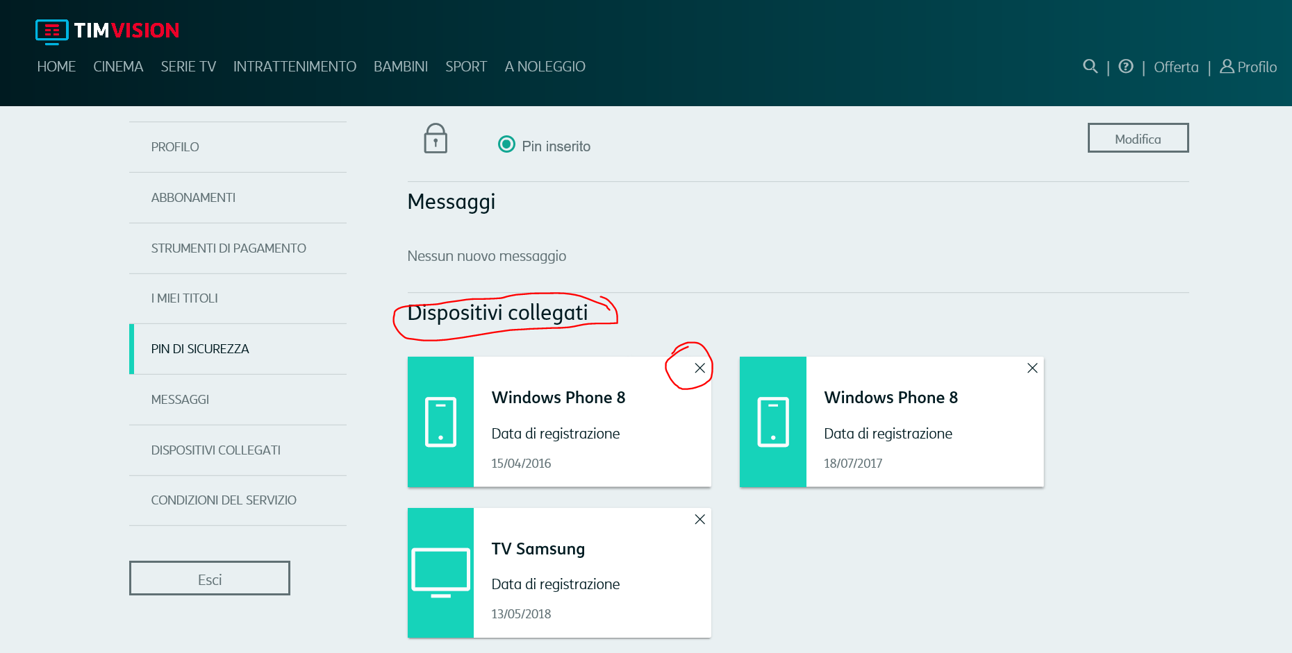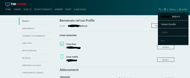 Si noti, per di più, che un abbonato a TIMVISION (e.g. chiunque abbia una linea fissa in fibra TIM) attualmente può utilizzare tale servizio su un massimo di 10 device, accedendo con il suo account con una qualsiasi tipologia di dispositivo (e.g. smart TV, smartphone, tablet, PC): la gestione dei device registrati è possibile dalla sezione Gestisci profilo del sito dove si può eventualmente disassociarne alcuni non più usati.