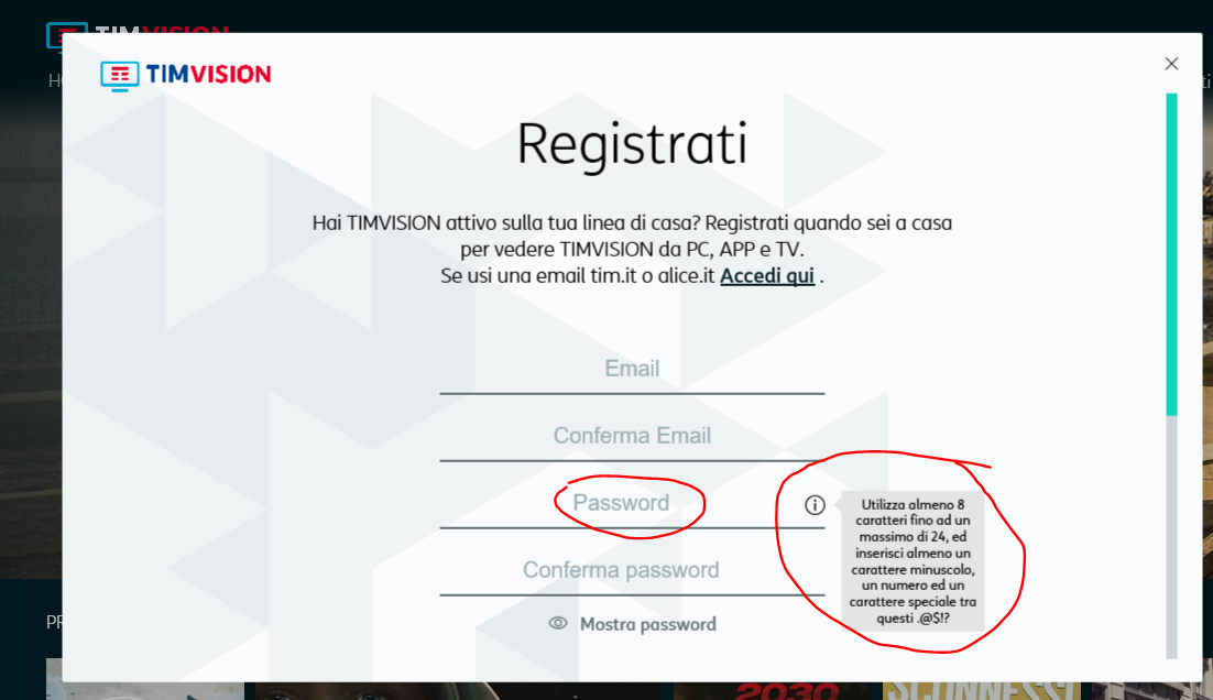 Per usufruire del servizio è sufficiente registrarsi a timvision.it collegandosi solo la prima volta dalla propria linea di casa TIM, ad esempio collegando il proprio PC/smartphone al suo Wi-Fi o immagino anche utilizzando direttamente l’app sul TV. La procedura è anche descritta in dettaglio sia in questa pagina della community WeTIM e sia su questa del forum dedicato a TIMVISION (P.S. 1/9/2019 Ho notato che quella pagina non risulta più presente, ma si può fare riferimento ad un altro articolo: TIMVISION: tutto quello che c’è da sapere). In pratica, la registrazione prevede di inserire un proprio indirizzo e-mail, creare una password ed accettare i termini e condizioni del servizio, dopo averne presa visione. Io ho utilizzato la mia email alice.it ed in quel caso esiste un link specifico nel form di registrazione, così come nel caso si scelga di mettere la propria email tim.it se uno ne possiede una.