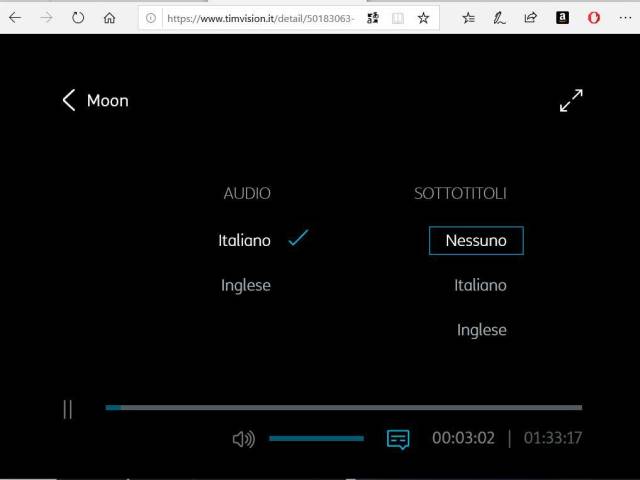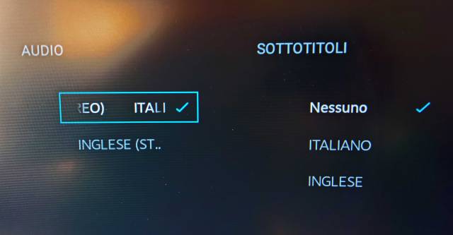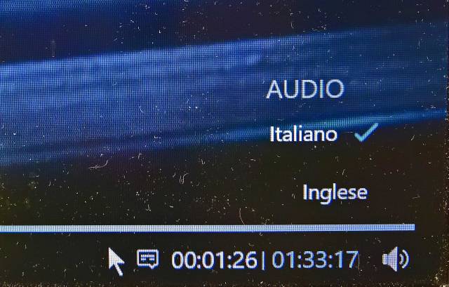 Per accedere al menù che consente di visualizzare queste eventuali opzioni, è necessario innanzitutto lanciare il film e poi cliccare sull’icona in basso a destra che compare sotto la barra del tempo (precisamente a sinistra dell’indicazione del tempo di riproduzione corrente). Personalmente non trovo particolarmente intuitiva la procedura da seguire e preferisco la scelta di Netflix che presenta le opzioni di riproduzione prima della visione del film: tuttavia, una volta appresa, è comunque agevole utilizzarla e può risultare anzi più comoda se si desidera modificare le opzioni durante la visione (seppure questa sia una ipotesi non frequente).