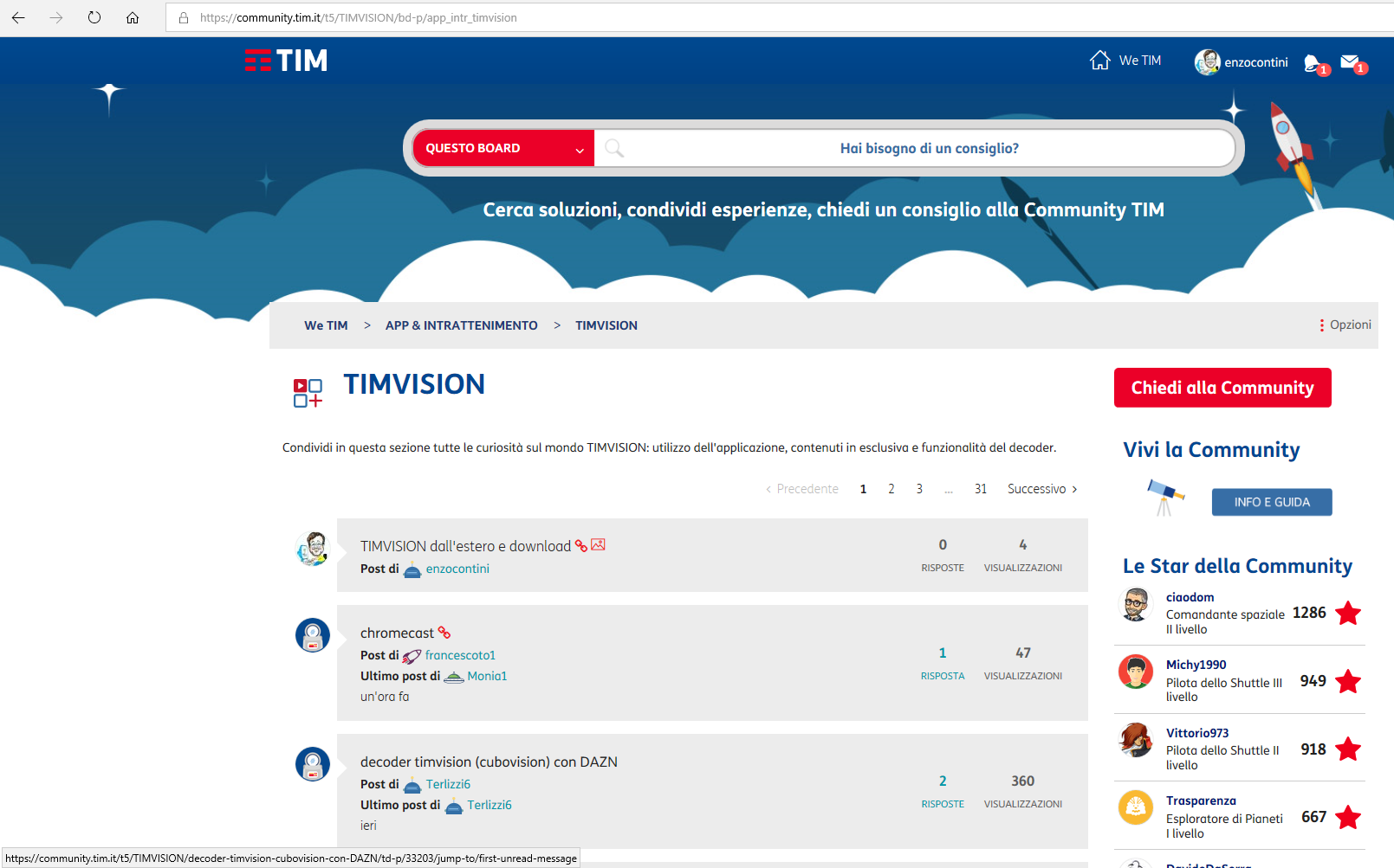 Sarebbe anche poi molto utile mettere, sempre nel sito TIMVISION, un forum in cui direttamente i clienti non solo possono trovare soluzioni alle loro domande ma possono anche fornire indicazioni, ad esempio, sulle marche e modelli di smart TV in cui loro stanno utilizzando il servizio. Questo servirebbe anche a TIM per avere indicazioni sulla compatibilità di questo servizio (secondo me non così ben delineata nelle indicazioni fornite ufficialmente nel sito stesso). In realtà un forum specifico su TIMVISION esiste a questo link nel portale della community WeTIM … quindi basterebbe inserire nella homepage di TIMvision un link che riporti a quello!! 🙂