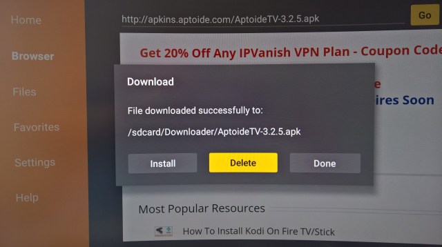 - Premendo il tasto Install, procedere all’installazione di Aptoide TV (versione ottimizzata per Set Top Box e Smart TV di Aptoide, market alternativo per Android che consente di scaricare moltissime applicazioni, tra cui Kodi, browser come Firefox, applicazioni di streaming musicale come Spotify e tante altre app non direttamente scaricabili dal Google Play Store).