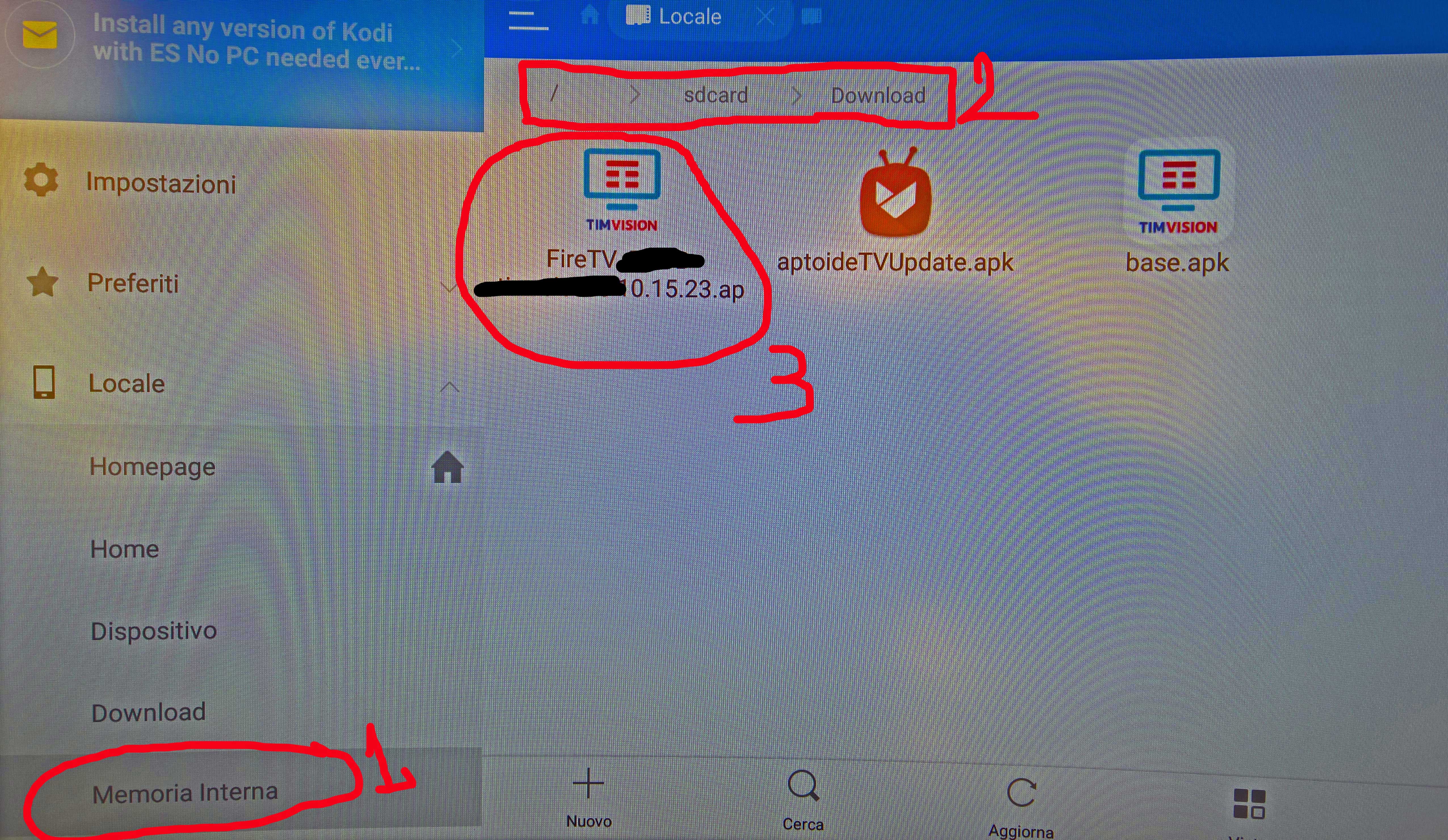 - Copiare l’APK dell’app TIM VISION nel Fire TV Stick, ad esempio nella sua sottocartella dedicata ai download (MTP USB Device\Memoria interna\Download);