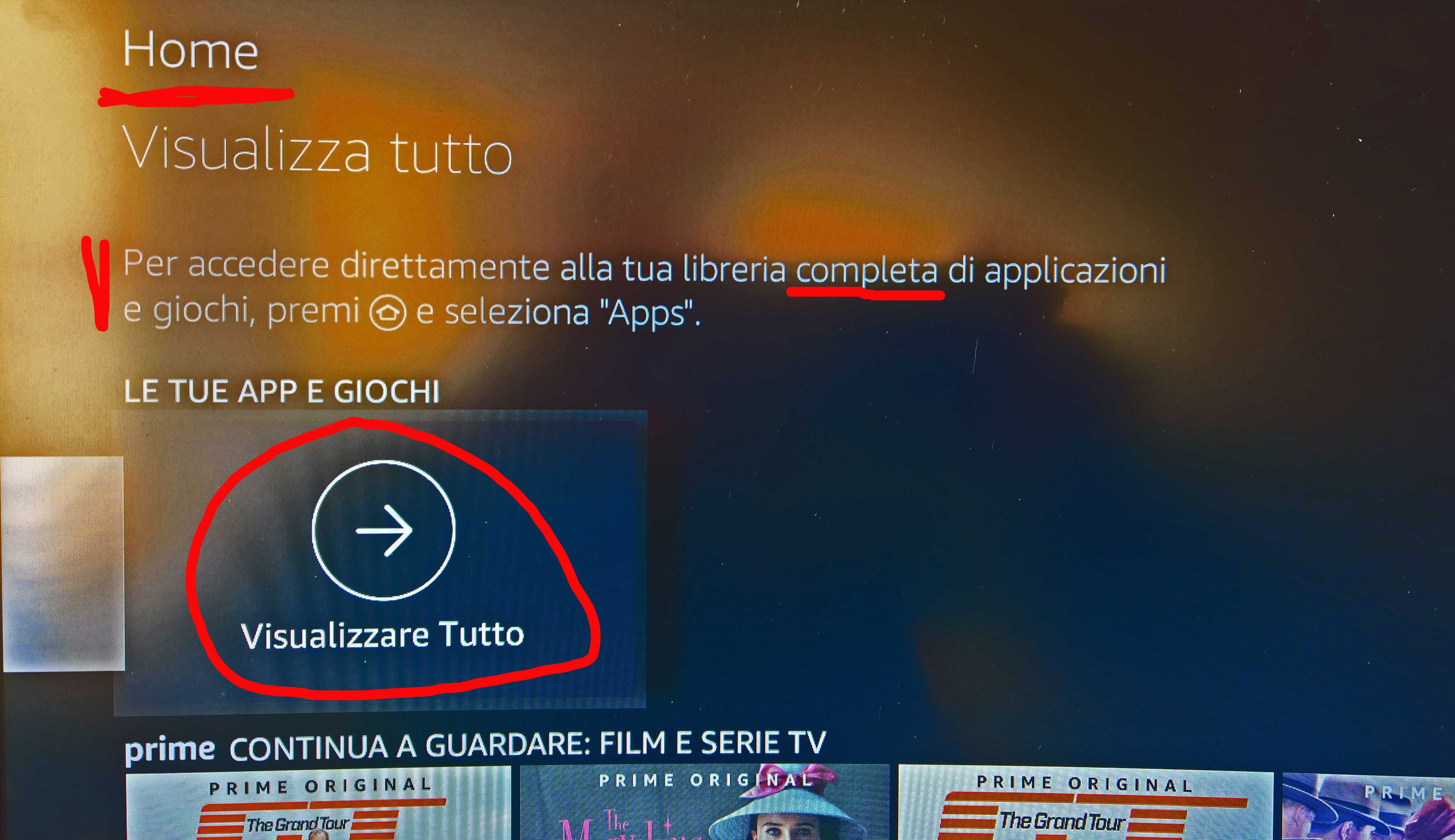 - Per poi vedere visualizzata tale app tra i preferiti, è sufficiente scorrere la prima riga della Home del Fire Stick (relativa appunto a Le tue app e giochi), premere il pulsante Visualizza Tutto e quindi selezionare quell’app (probabilmente si trova in fondo essendo stata appena installata).