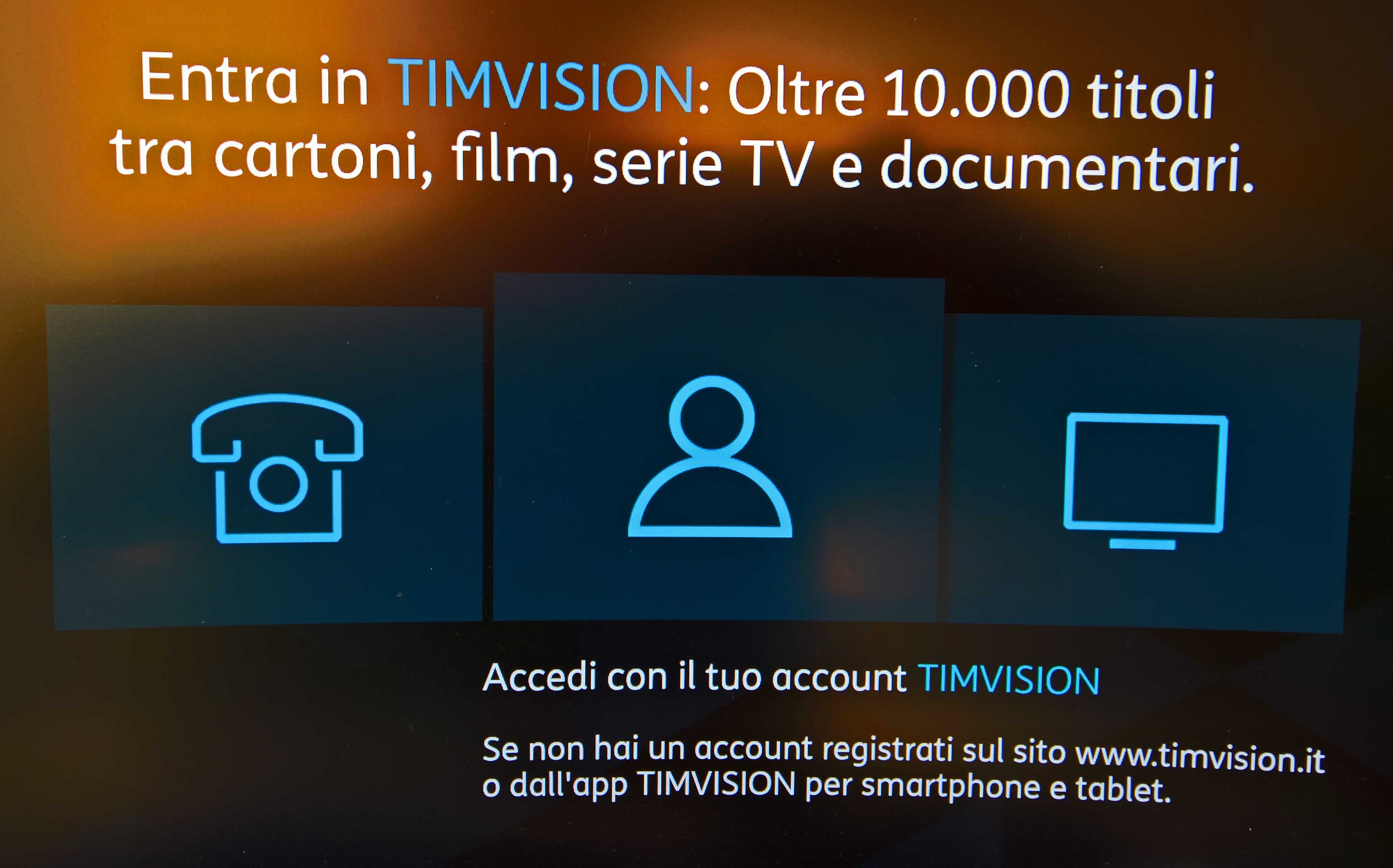 Se si lancia l’app Android su alcuni dispositivi (e.g. Fire Stick Amazon) vengono indicate le tre modalità con cui si può accedere al servizio: in particolare per accedere con il proprio account TIMVISION, viene suggerita la eventuale necessità di una registrazione (se non già effettuata) sul sito http://www.timvision.it o dall’app TIMVISION per smartphone e tablet.