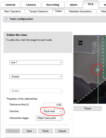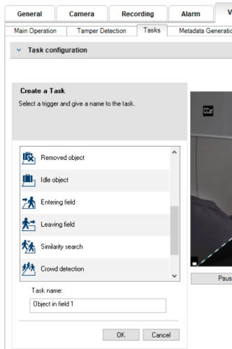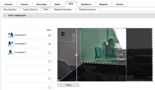 Each task can be set choosing one of the following logics in the Essential Video Analysis and then graphically drawing lines/areas on the stream image (for more details see Video Content VCA 6.30): Detect any object, Object in field, Crossing line, Entering field, Leaving field, Loitering, Following route, Removed object, Idle object, Counter, Entering field, Leaving field, Loitering, Following route, Removed object, Idle object, Counter, Occupancy, Crowd detection, Condition change, Similarity search.