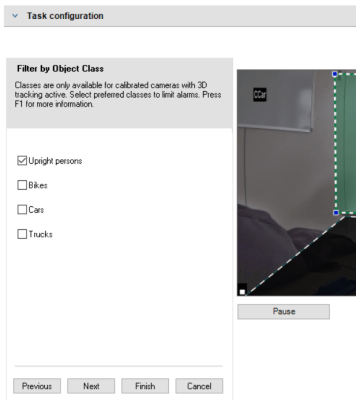 In order to possibly identify, in a Task definition, upright persons, bikes, cars or trucks, you have to set properly the VCA -> Metadata Generator -> Tracking tab section (i.e. 3D tracking or 3D people tracking if you are interested only in people identification).