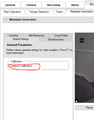 If the camera is calibrated, a proper indication is shown in the VCA -> Metadata Generation -> Global Settings tab.
