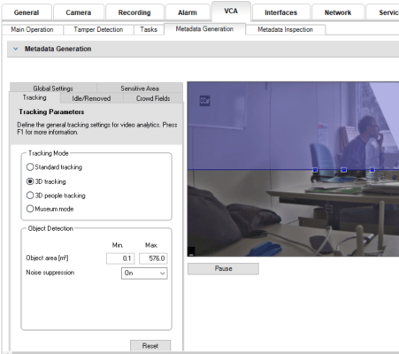 If needed, a filter on one or more available object classes can be set. Note that, as already stressed, to set an analysis on Object class, you need to properly set the Tracking me to 3D tracking or specifically to 3D people tracking if you are only interested to identify persons.