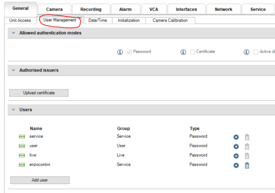 There are three types of user roles, the service, the user and live: only users of the first group can manage the camera configuration settings.