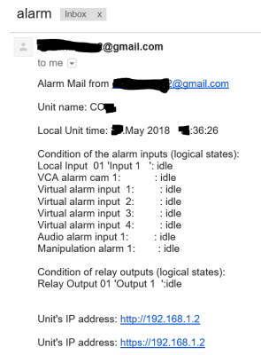 //{{email_start AlarmMail mail:={IP("smtp.google.com")To("myEmail@gmail.com")Layout(Standard)Camera(1)From("SenderEmail@gmail.com")Login("SenderEmail@gmail.com")Password("SenderEmailPSW")VCAOverlay(true)Format(256,144)Port(587)}; //}}email_end c8630e470b3f4345ee60e7e24b0615c9You can then test the correctness of your inputs using the Send Now button, that simulate an alarm event and should generate a new email in the inbox.
