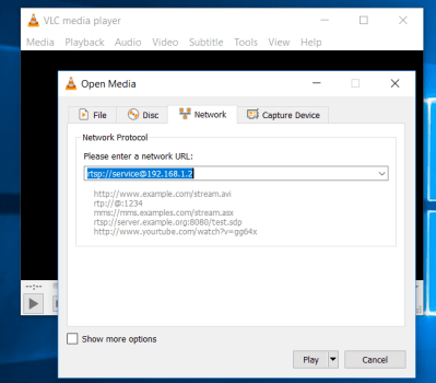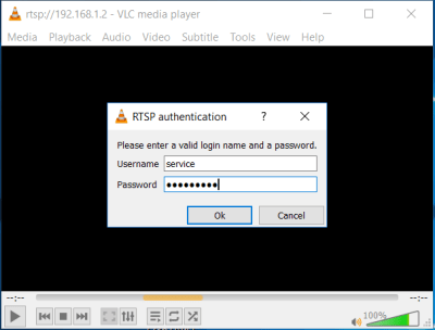 Once you know the IP address of the camera, you could even use what ever SW that allows to get a video stream, like VLC, as you can see from the following screenshots. Note that the protocol to be used for the communication of the camera stream is rtsp, so the URL to set should be, for example rtsp://service@192.168.1.2 if you want to login with a username service: a window asking for his password will popup, before you can get the camera stream in VLC. However, the video delay will be much greater than the one you experiment with the Bosch Configuration Manager client: therefore it is better to use this last one client.