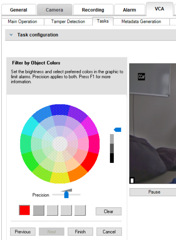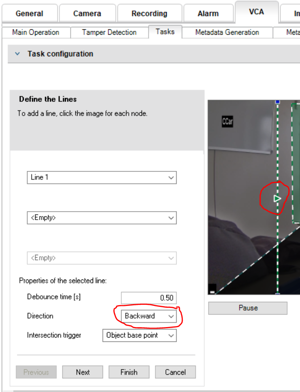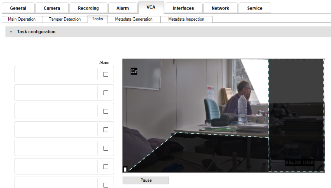 Each task can be set choosing one of the following logics in the Essential Video Analysis and then graphically drawing lines/areas on the stream image (for more details see Video Content VCA 6.30): Detect any object, Object in field, Crossing line, Entering field, Leaving field, Loitering, Following route, Removed object, Idle object, Counter, Entering field, Leaving field, Loitering, Following route, Removed object, Idle object, Counter, Occupancy, Crowd detection, Condition change, Similarity search.