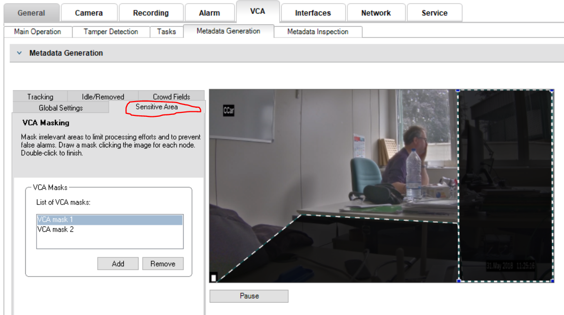 Configuring VCA, first of all you have to possibly mask irrelevant areas, in order to limit processing and also to prevent false alarms.