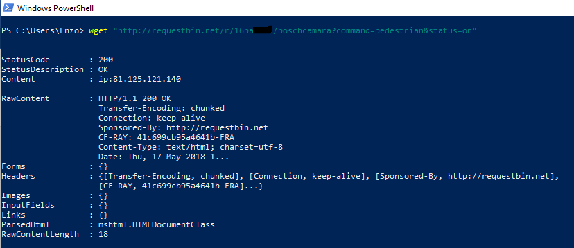 The URL created by requestbin.net site could be previously tested, just in case, using PowerShell, with a wget command as follows: