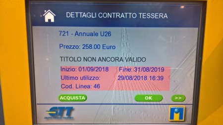 Tuttavia, uno degli scorsi anni, pur volendo fare solo un rinnovo, avevo dovuto fare comunque la coda agli sportelli gestiti dal personale GTT per poter cambiare la durata dell’abbonamento [dai soli mesi scolastici (10 mesi), utilizzato l’anno precedente, a tutto l’anno (12 mesi)]: troppo difficile sembrerebbe introdurre nell’interfaccia delle emettitrici automatiche dei biglietti e degli abbonamenti, aggiungere un pulsante per lasciare allo studente, ogni anno, la possibilità di scegliere tra le due possibili forme di rinnovo dell’abbonamento e non permettendo solo quello relativo alla formula scelta l’anno precedente!!
