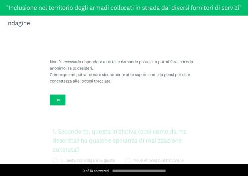 Dopo avere letto il post Come trasformare in piccole opere d’arte gli armadi collocati in strada da diversi fornitori di servizi, abbellendo così un territorio anziché deturparlo come avviene attualmente e/o avere partecipato all’evento in oggetto, se lo desideri puoi effettuare la seguente indagine a cui si può partecipare anche in modo completamente anonimo, se lo si desidera: sicuramente mi potrà tornare utile per dare concretezza alle ipotesi tracciate!