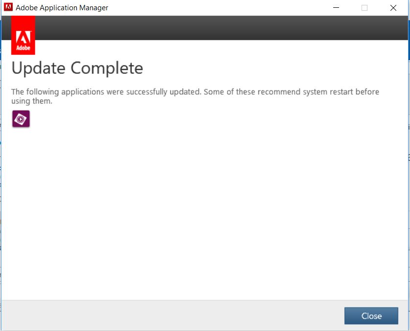 If you look at the program version you will notice that no update was really installed, even though a succede popup appeared!! In fact, something wrong happened and the update was not really installed and the solution is to download and install the last Adobe Application Manager that can be found at this link.