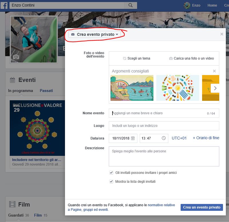 Se non si è soliti creare un evento su Facebook, può facilmente accadere di pubblicarlo come “privato”: infatti di default, quando si preme il pulsante Crea evento in Altro -> Eventi, risulta impostata l’opzione Crea evento privato.