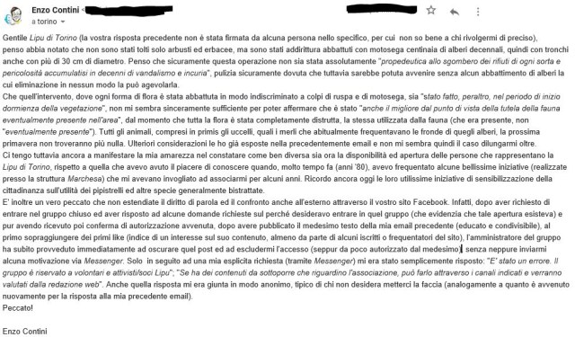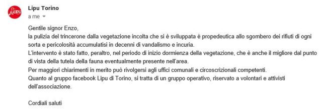 Risposta anonima della Lipu Torino che di fatto condivide con semplicismo i “lavori” effettuati