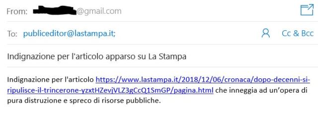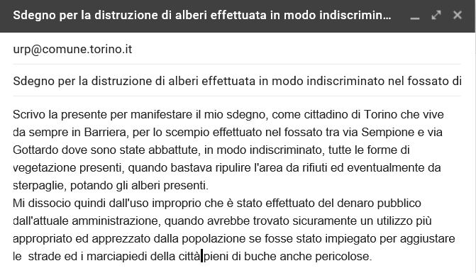 [e.g. scrivendo una email di protesta non solo a La Stampa – publiceditor@lastampa.it – relativamente all’impostazione data all’articolo che verrà analizzato nel seguito, ma soprattutto al Comune di Torino – urp@comune.torino.it – per manifestare il proprio sdegno per la distruzione effettuata in modo indiscriminato e lo spreco di denaro pubblico]