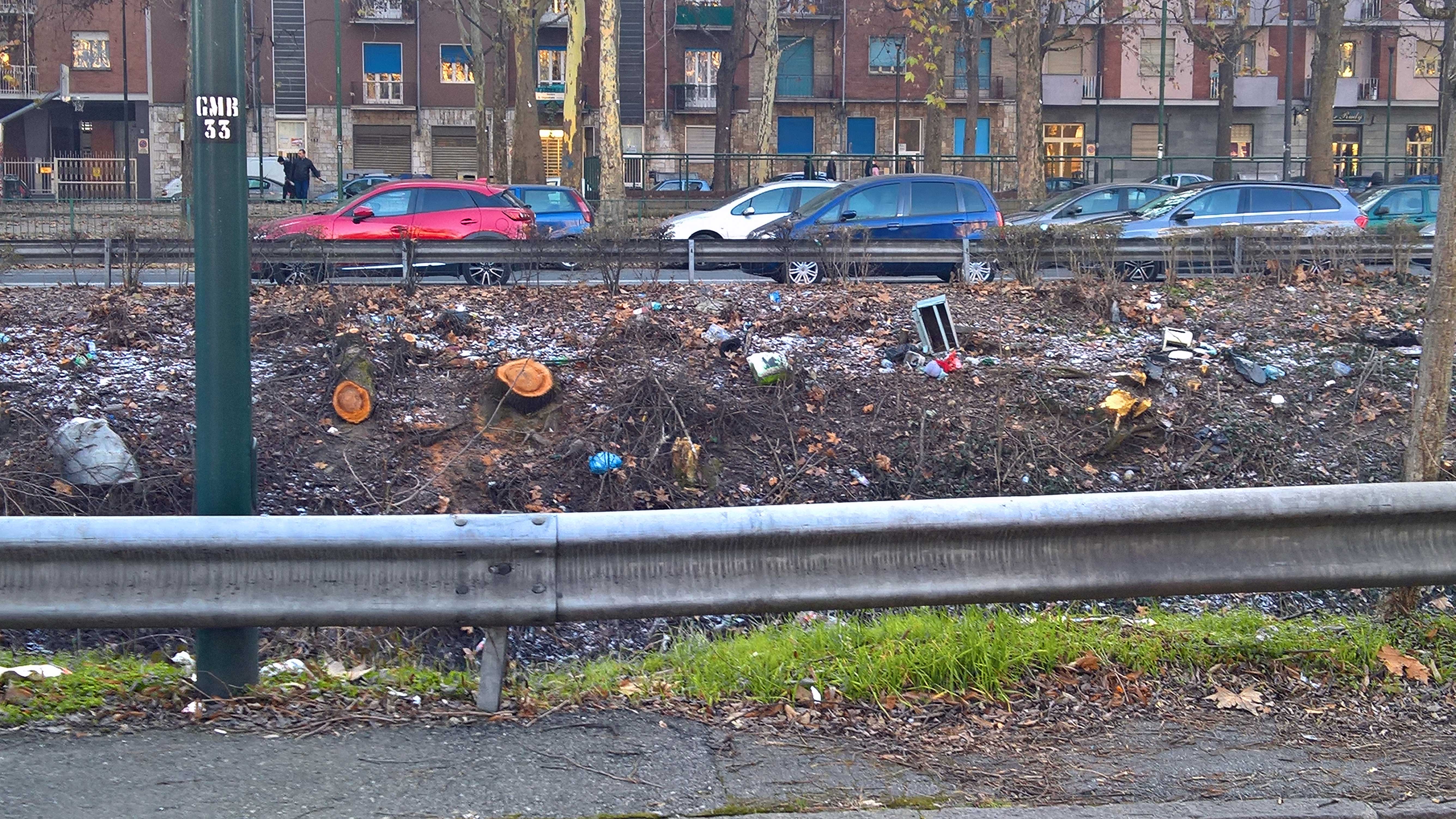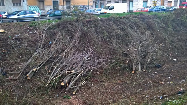 A Torino, nel fossato lungo circa 3 Km tra via Sempione e via Gottardo (che principalmente fino agli anni ’70 ospitava la rete ferroviaria per transito merci – seppure fosse rimasta comunque minimamente in funzione sino alla fine degli anni ’80) è stato eseguito un radicale intervento, che definirei vandalico, dove ogni forma di flora è stata abbattuta in modo indiscriminato a colpi di ruspa e di motosega. Nei decenni la Natura aveva fatto nascere e prosperare una foresta urbana di centinaia di alberi, capaci di ospitare uccelli e di svolgere tutte quelle ben note benefiche funzioni utili soprattutto in una città ad alto inquinamento qual è Torino.