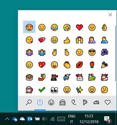 An alternative way to have emoticons be displayed is to press Windows key + . (alias the key with the Windows flag together with the point key of a real keyboard). The following popup window will appear, showing the same all emoticons: