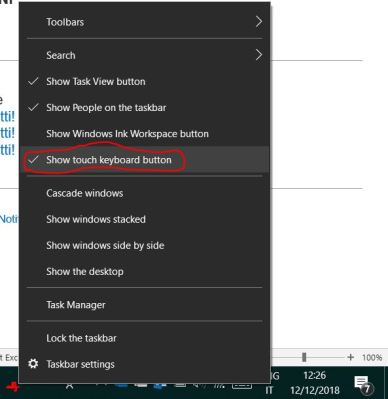 Possibly, if your PC is not set in Tablet mode, it is not shown that Touch Keyboard icon in the bottom toolbar. If so, to have it always shown even though your PC is not set in Tablet mode, you have to right click on whatever free area of the toolbar and check the Show touch keyboard button item in the shown popup menu: