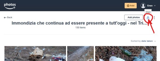 Therefore, if you want to share an album you have previously created from some uploaded photos, from the Amazon Photo site select it and, once you are in that album, click the Share icon you will see on the top right of the page. In the following you can find each step of the simple procedure: