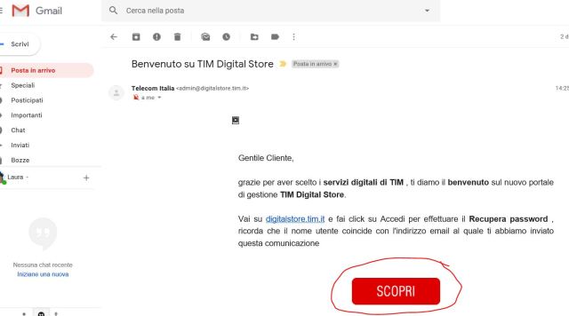 Email, ricevuta al termine della procedura, che invita di recarsi nel sito digitalstore.tim.it per crearsi una password tramite la sua procedura di recupero password