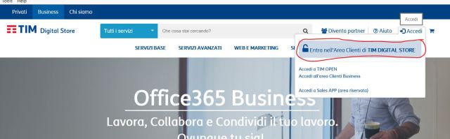 Premere Accedi e selezionare Entra nell’Area Clienti TIM DIGITAL STORE