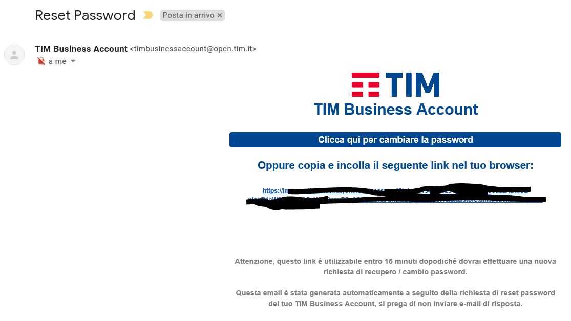Al termine, conclusa la procedura di creazione del TIMid, viene ricevuta un’ultima email che invita a recarsi nel sito digitalstore.tim.it per crearsi una password tramite la sua procedura di recupero/reset della password: si noti che lo username da utilizzare corrisponde all’indirizzo di email inserito durante la registrazione precedente.