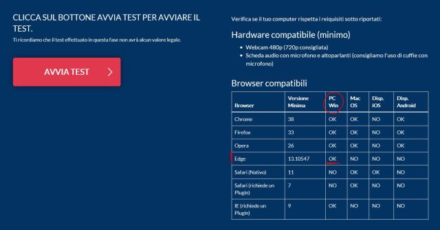 Compatibilità dei diversi browser per effettuare l’opzionale test della webcam