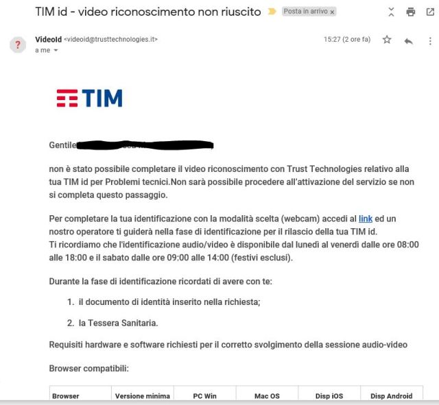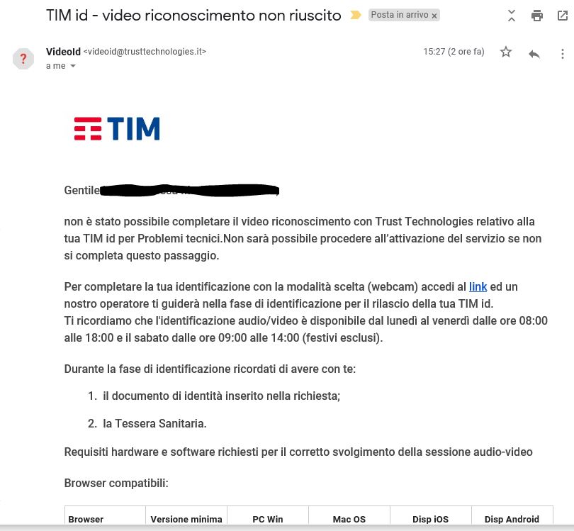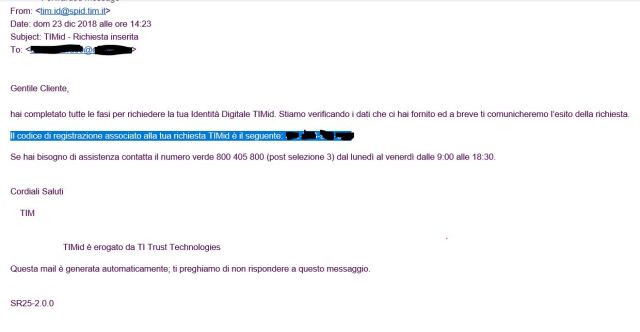 Mail di notifica completamento della procedura con indicazione del “codice di registrazione associato alla tua richiesta TIMid”.