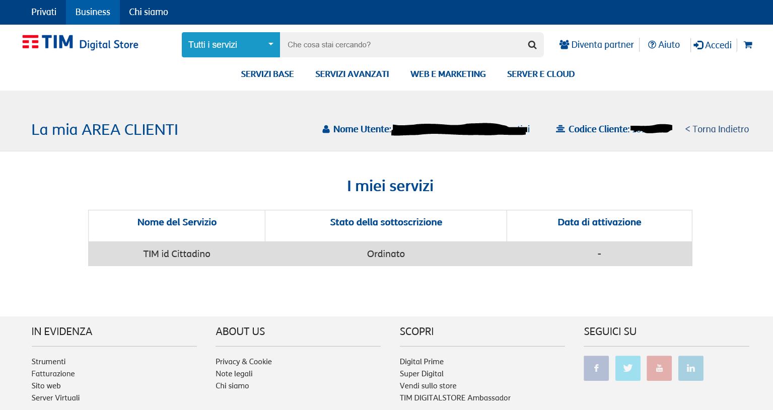 Sezione I MIEI SERVIZI in cui, risulta presente quello relativo al TIM id Cittadino il cui lo “Stato della sottoscrizione” è Ordinato