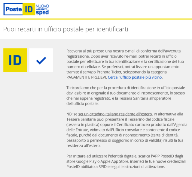 Una volta che è stato effettuato il riconoscimento recandosi in un ufficio postale con il documento, nel giro di qualche ora arriva all’indirizzo email indicato nella registrazione, un messaggio che comunica l’avvenuta attivazione del Servizio PosteID abilitato a SPID.