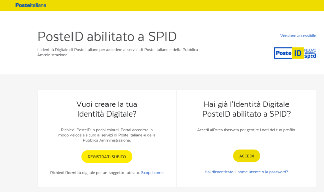 Il sito posteid.poste.it serve sia per registrarsi e richiedere una propria identità digitale (SPID) sia, successivamente, per gestire quel PosteID fornito dalle Poste Italiane: in quest’ultimo caso si deve premere il tasto ACCEDI.