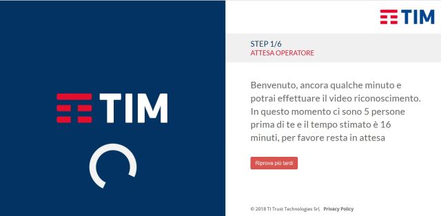 Effettuando il click su quel link (o copiando l’URL associata ed inserendola ne browser (consiglio Chrome), compare la videata seguente che richiede di attendere il proprio turno per attivare il dialogo con un operatore tramite video chiamata. L’operatore comparirà nella finestra a sinistra insieme ad una finestra più piccola in cui uno si può vedere.
