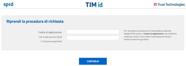 Premendo infatti tale link, viene proposta la pagina seguente in cui viene richiesto di inserire il codice registrazione (fornito precedentemente in una delle email ricevute da tim.id@spid.tim.it) ed il proprio codice fiscale.