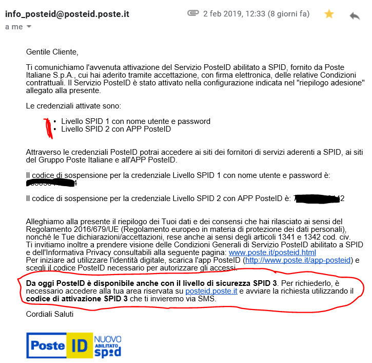 Si noti che nella prima email viene detto anche “Da oggi PosteID è disponibile anche con il livello di sicurezza SPID 3. Per richiederlo, è necessario accedere alla tua area riservata su posteid.poste.it e avviare la richiesta utilizzando il codice di attivazione SPID 3 che ti invieremo via SMS”.