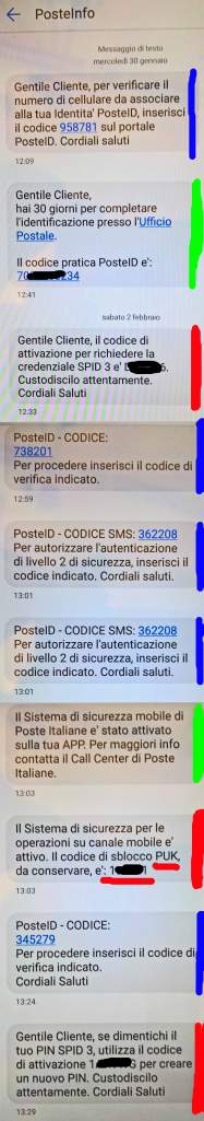 Come già evidenziato, molti sono gli SMS che si ricevono da PosteInfo durante tutta la procedura e questi risultano di diverso tipo ed importanza. In particolare quelli MOLTO IMPORTANTI, secondo me, non risultano sufficientemente evidenziati per quella loro rilevanza in futuro e probabilmente sarebbe stato meglio che avessero inserito qualche paralo di più. Perciò, nel seguito li riporto tutti una figura, contrassegnando con un diverso colore ciascun SMS in base alla sua tipologia ed evidenziando in rosso quelli di notevole importanza da non perdere e da salvare opportunamente.