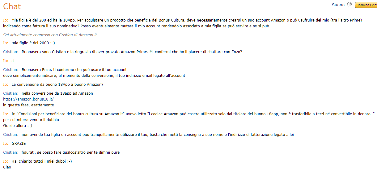 Come indicato chiaramente dalla chat seguente con il centro assistenza Amazon, risulta infatti sufficiente mettere la consegna a nome della persona di cui è il buono ed indicare la medesima nell’indirizzo di fatturazione legato.