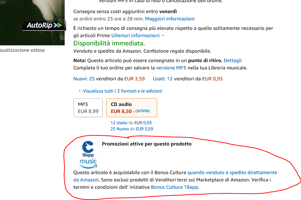 Viene anche specificato: “Il bonus cultura può essere utilizzato per acquisti nelle categorie Libri (venduti e spediti da Amazon), eBook Kindle, CD, Vinili e DVD musicali su Amazon.it entro il 31 dicembre 2019.