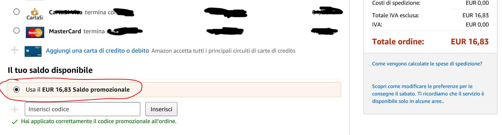 Si noti che il codice Amazon generato non è inseribile con le modalità classiche di inserimento di un Buono Regalo, bensì inserendolo nell’apposito campo relativo all’inserimento di un codice presente nella videata relativa alla modalità di pagamento mostrata in seguito ad un acquisto.