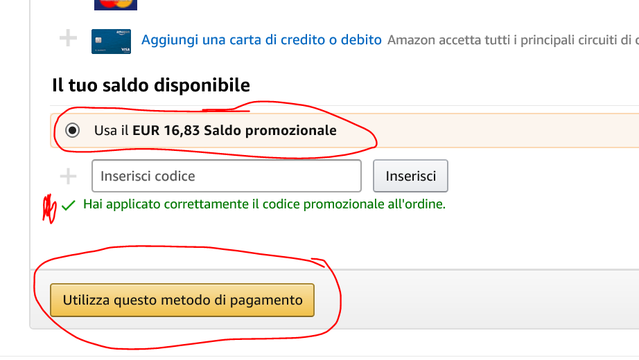 NOTA BENE – Se per caso, oltre ad un credito di buoni 18app, hai caricato anche un classico buono regalo Amazon, affinché ti venga scalato sul credito 18app l’importo relativo ad un acquisto di un prodotto 18app compatibile, DEVE essere selezionato come metodo di acquisto quello di una carta di credito e NON il buono regalo: diversamente l’importo verrebbe scalato su quest’ultimo ( e probabilmente non è quello che desideri scadendo i buoni 18app a fine anno!!).