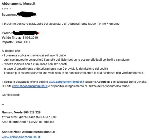 Si noti che il codice ha una scadenza di validità, per cui deve essere utilizzato per richiedere la carta di Abbonamento Musei Piemonte entro quella data indicata: qualora non sia utilizzato entro quella data non viene rimborsato!